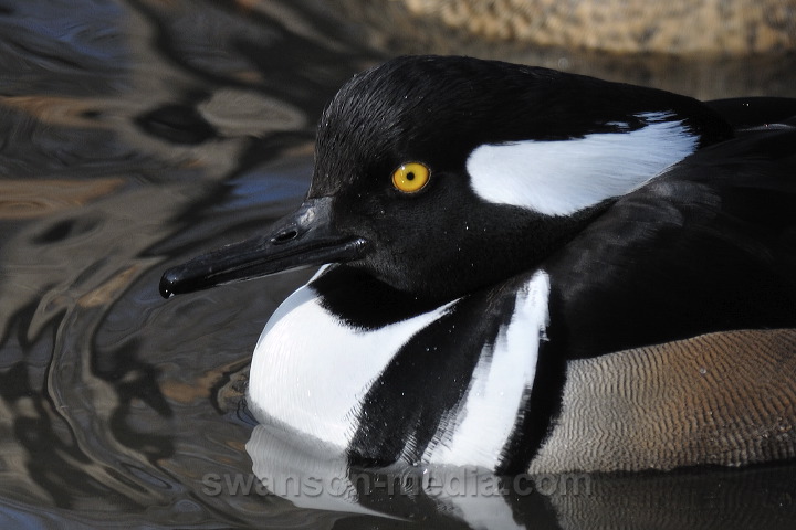 # Title Hooded Merganser (male) Description A male Hooded Merganser (Lophodytes cucullatus) swims in a Chicago pond in winter. Location and Date North Pond Nature Sanctuary Chicago, Illinois, USA 2/8/10 (Note: pre-2000 dates are approximate) Credit Mark Swanson/Swanson Media Camera/Source Nikon D300 DSLR Lens AF VR-Nikkor 80-400mm f/4.5-5.6D ED Model/property releases available? Not applicable/Not applicable Keywords Hooded Merganser (Lophodytes cucullatus), winter, ponds, parks, Class Aves (Birds), Kingdom Animalia (Animals), Family Anatidae, Subfamily Merginae (sea ducks), Order Anseriformes (Ducks/Geese/Swans) |