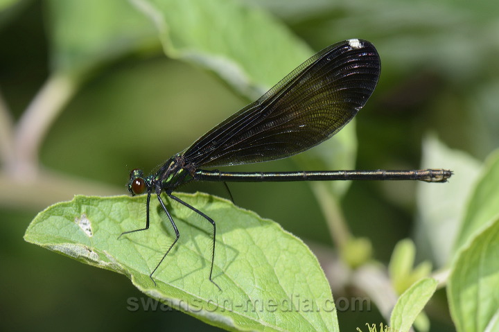 # Title Ebony Jewelwing (female) Description A female Ebony Jewelwing (Calopteryx maculata) perches on a leaf near Nippersink Creek. Location and Date Glacial Park Conservation Area Ringwood, Illinois, USA 7/18/15 (Note: pre-2000 dates are approximate) Credit Mark Swanson/Swanson Media Camera/Source Nikon D7100 DSLR Lens AF-S VR Micro-Nikkor 105mm f/2.8G IF-ED Model/property releases available? Not applicable/Not applicable Keywords Ebony Jewelwing (Calopteryx maculata), Jewelwings (Calopteryx sp.), Broad-winged Damselflies (Calopterygidae), Damselflies (Zygoptera), Odonata, Class Insecta (Insects), Phylum Arthropoda (Arthropods), Kingdom Animalia (Animals) |
