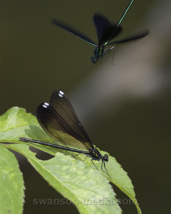 # Title Male Ebony Jewelwing Swooping in Toward Female Description A male Ebony Jewelwing (Calopteryx maculata) swoops down toward a female perched on a leaf along the edge of a river in the Blue Ridge Mountains. Location and Date Linville Land Harbor near Linville, North Carolina, USA 6/4/19 (Note: pre-2000 dates are approximate) Credit Mark Swanson/Swanson Media Camera/Source Nikon D500 DSLR Lens AF-S Nikkor 80-400mm f/4.5-5.6G ED VR Model/property releases available? Not applicable/Not applicable Keywords Ebony Jewelwing (Calopteryx maculata), Jewelwings (Calopteryx sp.), Broad-winged Damselflies (Calopterygidae), Damselflies (Zygoptera), Odonata, Class Insecta (Insects), Phylum Arthropoda (Arthropods), Kingdom Animalia (Animals) |