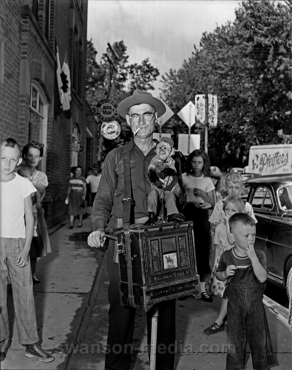 # Title Organ Grinder Description An organ grinder with monkey at the Vassar, Michigan, centennial celebration (1949). Location and Date — Vassar, Michigan, USA 7/28/49 (Note: pre-2000 dates are approximate) Credit Richard Swanson/Swanson Media Camera/Source Graflex Pacemaker Speed Graphic (4x5 inch black & white negative) Lens Kodak Ektar 6" (152mm) f/4.5 Model/property releases available? No/No Keywords organ grinder, organs, monkeys, musical instruments, sidewalks, entertainment, Kingdom Animalia (Animals), Caucasians, 1940s, 1950s, black and white, black & white |